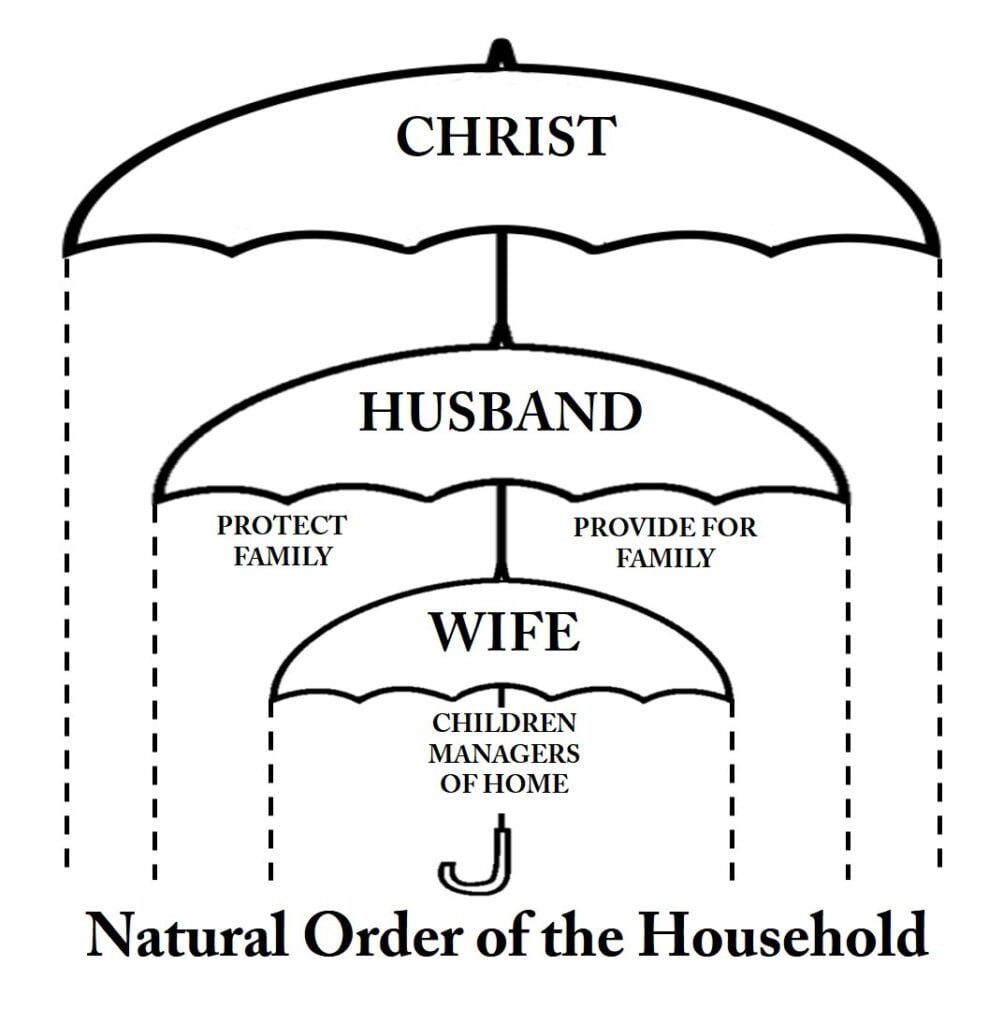 Este es un concepto protestante estándar de nuestra relación con el Mesías. En esta imagen, el Mesías cubre al marido, y el marido cubre a su mujer e hijos. No hay sacerdocio, ni ancianos (laicos) de la congregación, ni siervos de la congregación (diáconos).