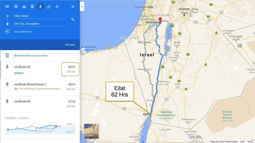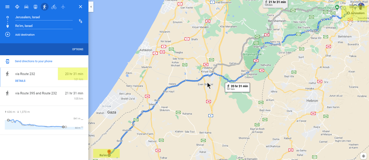 Bien, la logística aquí es imposible. Aquí tenemos el Mapa de Google. Puedes ver Belén un poco al sur de Jerusalén. Se trata de un paseo de unas dos o tres horas. Pero si vas a venir desde un lugar como Re’im, cerca de la franja de Gaza, son como 20 o 21 horas de camino. Eso es como dos días largos si se trata de un caballo, o tal vez sean tres días si se trata de un varón mayor, porque todos los varones tienen que subir. Así que, aunque seas un varón mayor, quizá no tengas burros para montar, quizá tengas que ir a pie, por lo que serán dos o tres días.