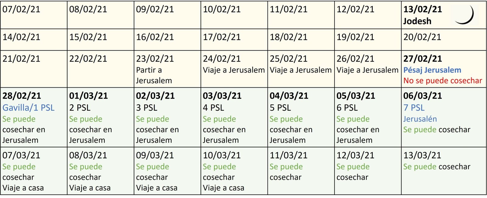 Observa aquí en la línea superior que Pésaj es el día 27. Este año el verdadero Pésaj tuvo el mismo patrón que vimos en Josué 5. Esto ocurre aproximadamente una vez cada siete años. Pésaj, en promedio, va a caer en cualquier día de la semana, pero al igual que en Josué 5 este año (2021) tuvimos Pésaj en Shabat y luego la Gavilla Mecida al día siguiente. Así que, si esto hubiera sido en las llanuras de Gilgal y Jericó, entonces habríamos celebrado Pésaj en Shabat y, entonces, habríamos celebrado la Ofrenda de la Gavilla al día siguiente. Entonces podrías cosechar y participar de la nueva cosecha, sin problemas. Pero eso no significa necesariamente que el grueso de la cosecha estuviera maduro, eso es una suposición por parte de los Caraítas, y probablemente sea incorrecta. Ten en cuenta este pensamiento.