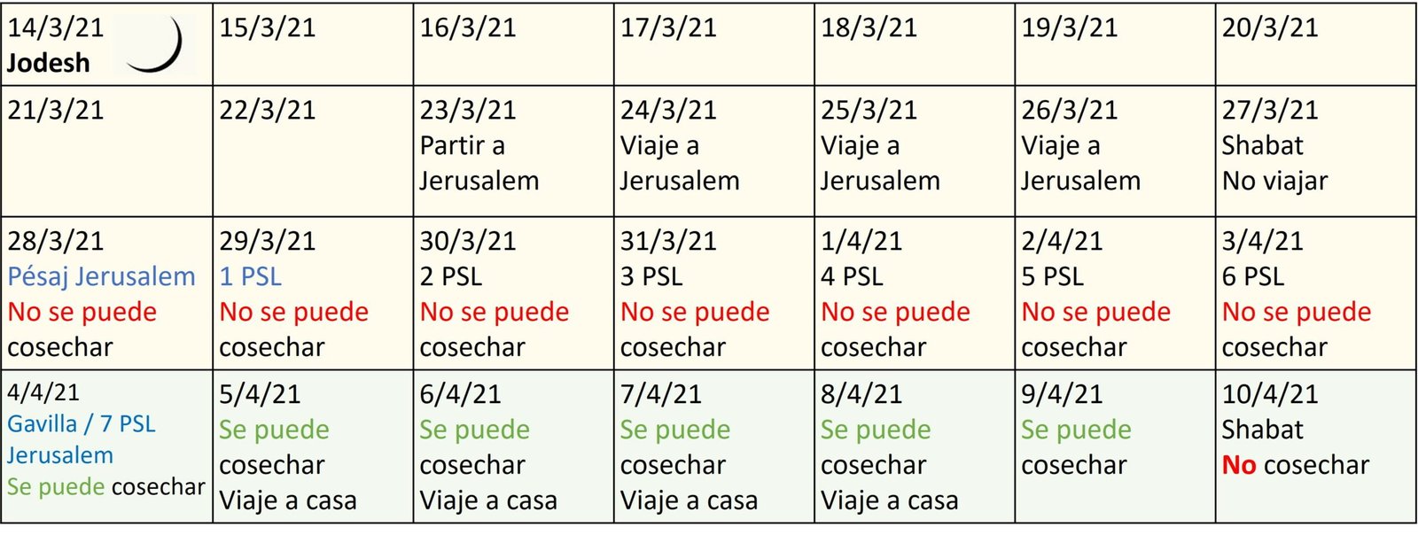 Tenemos el Día de la Luna Nueva en Shabat. Dos semanas después, el 14 de Aviv (el día 14 del primer mes), se celebraba Pésaj. Y una vez que Israel recibió su herencia, todos los varones debían estar en Jerusalén.