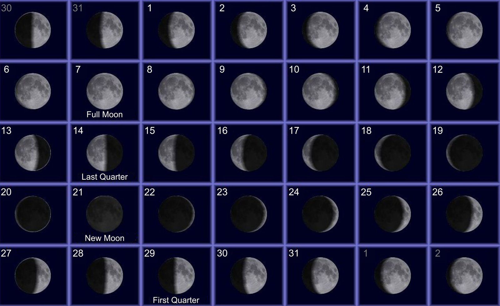 El siguiente cuadro ilustra por qué el sábado lunar es tan difícil (si no imposible) de guardar. Aunque a veces la luna puede asomar en el cielo, normalmente es pequeña y no es fácil de leer (incluso en las noches claras en las que no hay nubes). Pero lo más importante es que las fases de la luna no son discretas. En el siguiente gráfico, el cuadrante superior izquierdo representaría un sábado, porque es una fase lunar (primer cuarto). Sin embargo, la siguiente fase lunar llega ocho días después (segunda fila hacia abajo, segunda desde la izquierda), lo que hace que la semana sea de ocho días. Tal vez se podría haber adivinado que el día de preparación debería haberse celebrado el día 7 (suponiendo que no hubiera nubes), pero entonces se observa que la luna está llena durante dos días enteros. ¿Cuál de estos dos días debe guardarse como sábado lunar? No hay manera de saberlo porque Yahweh no dice nada sobre cómo resolver este tipo de problemas (y de hecho, toda la construcción no es lo que Él manda.