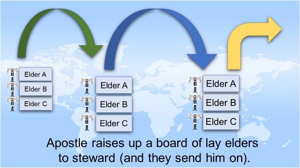 A continuación, el apóstol reúne a los que son dignos en un lugar apartado para el culto (idealmente no una casa). Entonces, mientras está enseñando al pueblo, también identifica quién es capaz de dirigir y enseñar al pueblo en su ausencia. A continuación, nombra (o reconoce) a los que son capaces como ancianos de la congregación (también llamados obispos).