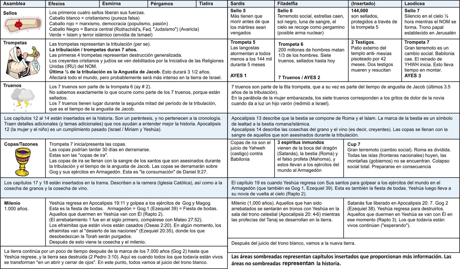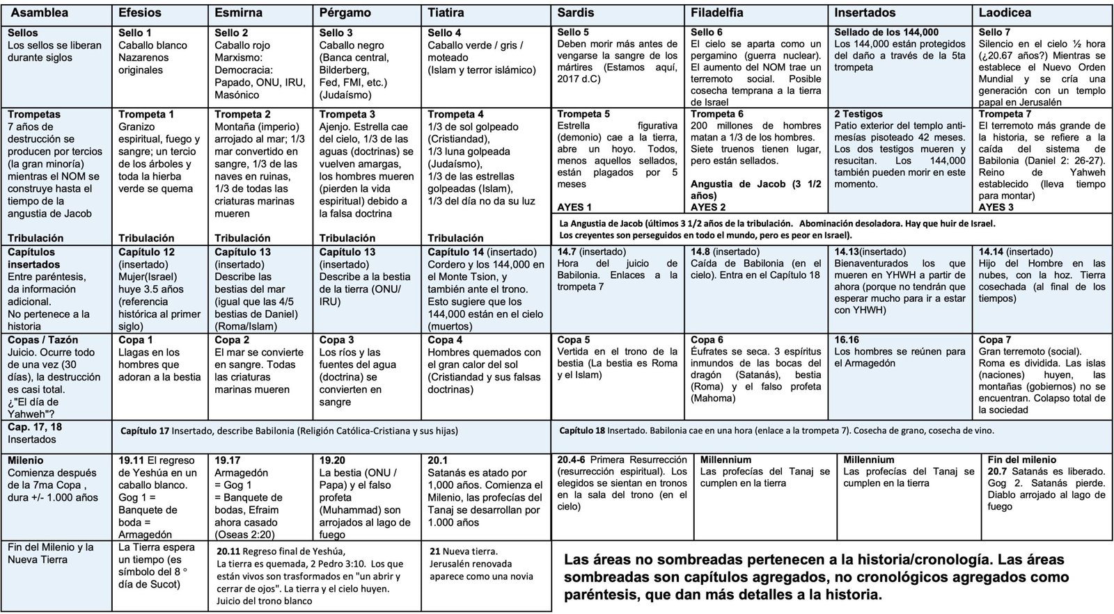 La mayoría de los pasajes en Apocalipsis pertenecen a una secuencia cronológica de eventos, que llamamos la historia. Mostramos la historia limpia en las siguientes tablas (gráficos).
