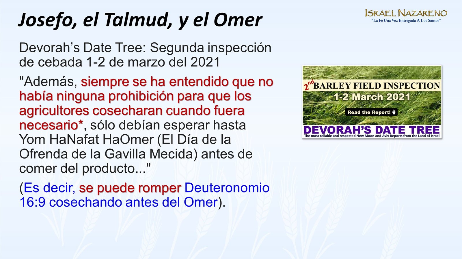 6. Y como pregunta final, incluso si los rabinos condonaron la ruptura de Deuteronomio 16:9 en el pasado, y esta hipocresía, este quebrantamiento de la Torá, este pecado, esta desobediencia flagrante a las palabras de Elohim que está registrada en el Talmud. ¿Significa eso que debemos hacer lo mismo sólo porque ellos pecaron en los tiempos del Talmud? ¿Significa eso que también podemos pecar? Y en particular, si podemos comprobar en “Cebada Aviv Simplificada” y en otros estudios que hay una forma mejor de hacerlo que no requiere romper Deuteronomio 16:9, entonces ¿por qué no hacerlo así? Especialmente cuando da testimonio del papel de Yeshúa como el Omer. ¿O acaso es por eso que específicamente no lo hacen? ¿Es porque da un testimonio del papel de Yeshúa como el Omer? Esta es la última pregunta que me hago.