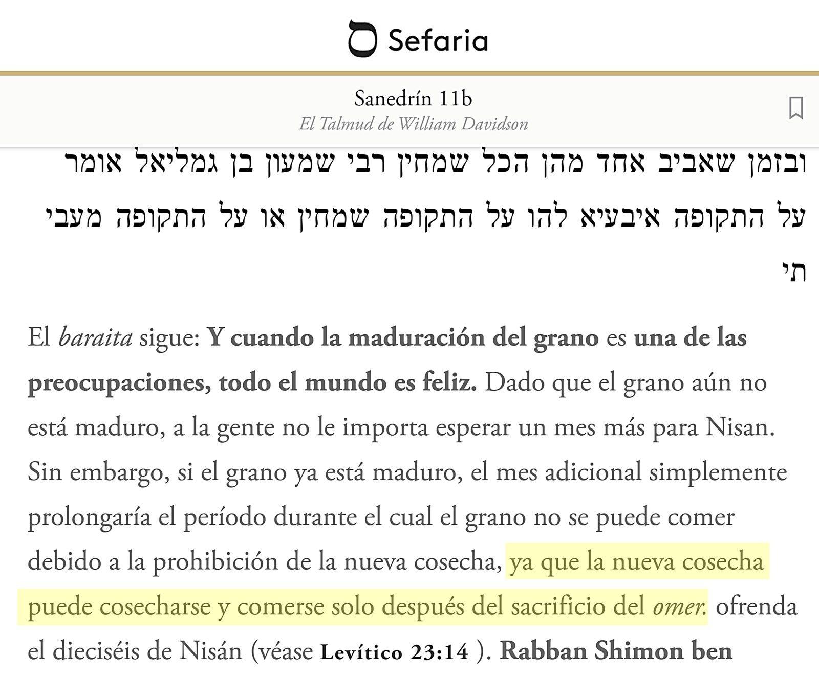 “La Baraita continúa: Y cuando la maduración del grano es una de las preocupaciones, todos están contentos. [Eso está en el Hebreo, pero luego añade]: Como el grano aún no está maduro, a la gente no le importa esperar un mes más para Nissan (o aviv). Sin embargo, si el grano ya está maduro, el mes extra simplemente prolongaría el período durante el cual el grano no puede ser comido debido a la prohibición de la nueva cosecha, ya que la nueva cosecha puede ser cosechada y comida sólo después del sacrificio de la ofrenda del omer el día 16.”