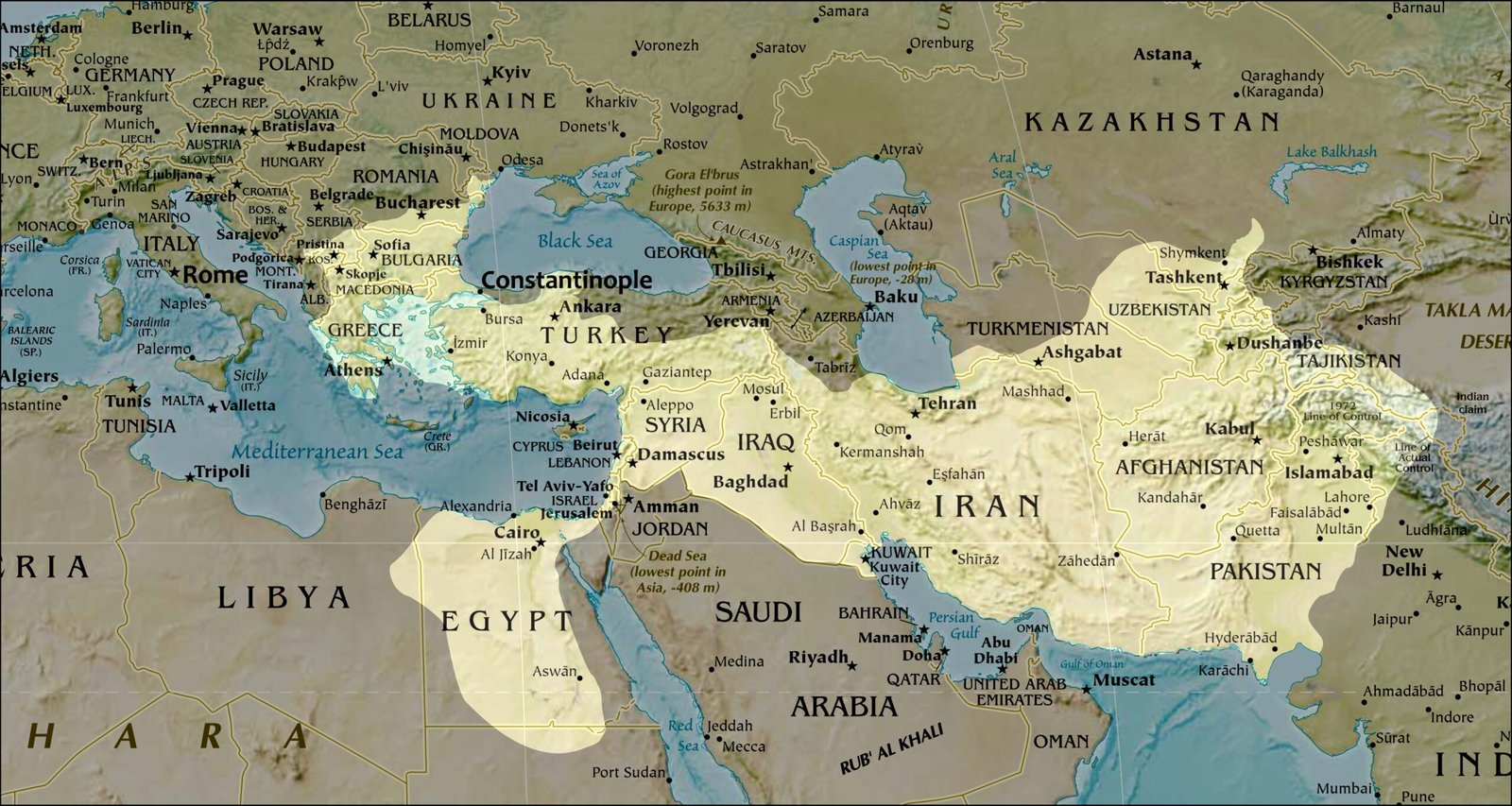El Imperio Romano rodeó el Mediterráneo y se extendió a Europa y Medio Oriente. Mientras que la parte occidental del imperio Romano sigue siendo Católica o Cristiana Protestante, la parte oriental del imperio se ha vuelto predominantemente Islámica.