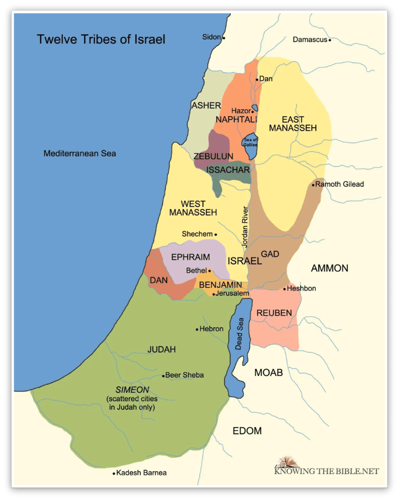 Pero en su día, el patriarca Jacob (Yaakov), más tarde rebautizado como Israel, tuvo doce hijos. Cada uno de los doce hijos de Israel engendró una de las llamadas Las Doce Tribus de Israel. Pues bien, Moisés sacó a las doce tribus de Israel de Egipto, y luego Josué las condujo a la Tierra Prometida. Entonces las doce tribus se establecieron en la tierra de Israel, cada una en su territorio tribal específico.
