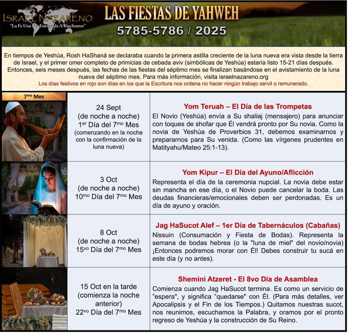 La tarde del 23 de septiembre de 2025 comenzó el séptimo mes hebreo. Shemini Atzeret 5786 (2025) es hasta la tarde del 15 de octubre. Shemini Atzeret marca el fin de las fiestas bíblicas del año.…