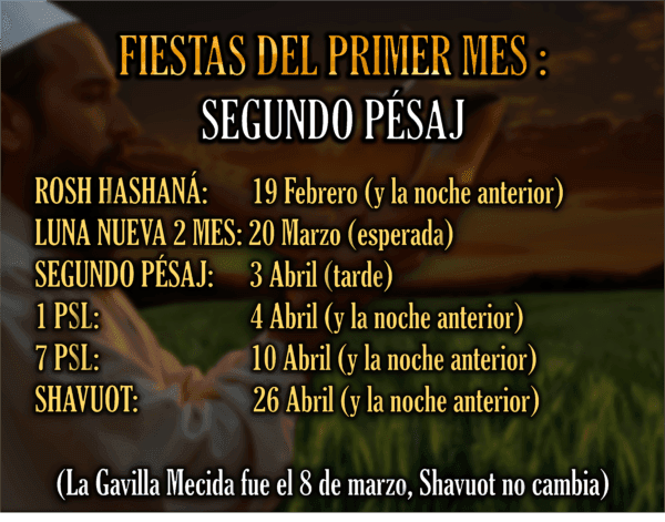¡ACTUALIZACIÓN! 8 de marzo de 2026: La luna nueva se avistó desde Israel la noche del 18 de febrero. En ese momento, ningún grupo de observadores de cebada informó de la presencia de cebada “aviv” en la Tierra de Israel, por lo que declaramos un duodécimo mes. El 5 de marzo recibimos información de Sighted Moons que nos obliga a revocar la decisión anterior y a declarar la próxima luna nueva (prevista para el 20 de marzo) como el segundo mes hebreo. IN celebrará un segundo Pésaj este año. (Las fechas dependen de la confirmación del nuevo mes). Por favor, consulta la publicación para obtener todos los detalles.