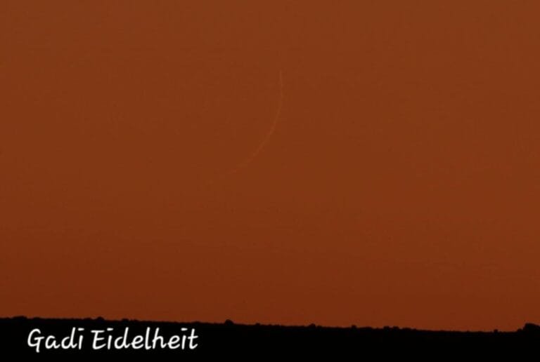 La luna nueva del 10º mes Hebreo fue presenciada desde Israel a las 4:57 pm, el 2 de diciembre de 2024, por Gadi Eidelheit. Crédito de la foto: Gadi Eidelheit.