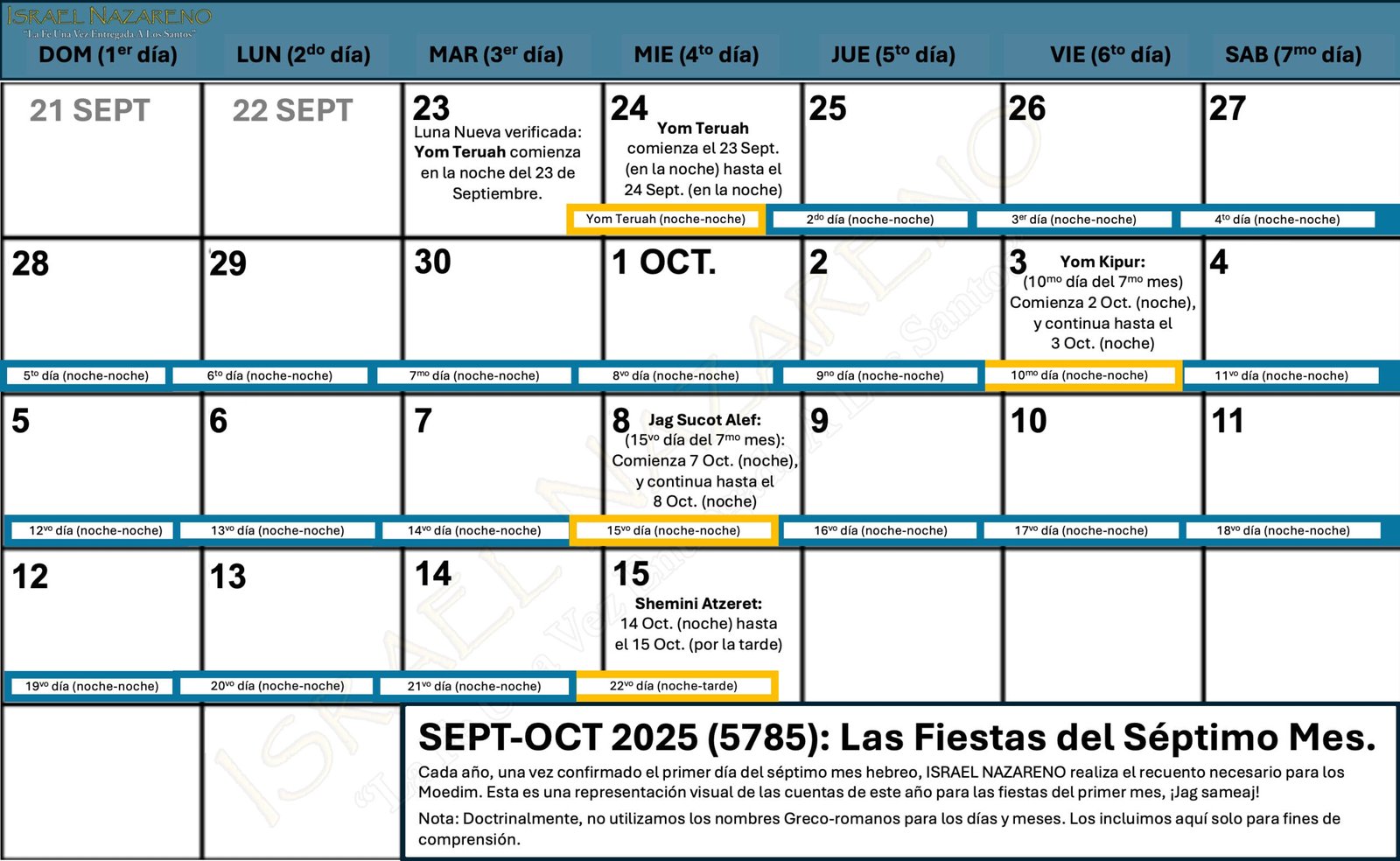 La noche del 23 de septiembre de 2025 comenzó el séptimo mes hebreo. Yom Kipur 5786 (2025) comienza en la noche del 2 de octubre y continúa hasta la noche del 3 de octubre. Yom Kipur es un día de ayuno, oración y reflexión como la novia de Yeshúa (discípula comprometida).